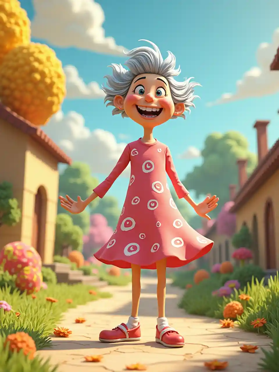 vista extrema a largo plazo, de pies a cabeza, estilo Dr Seuss, abuela risueña Seuss con un patrón de remolinos rosa y naranja Ropa de primavera Animación 3D en BG whoville Tema de primavera,