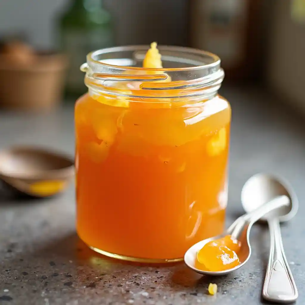 Un frasco de mermelada de naranja casera de Sevilla con mucha corteza de naranja en el frasco, sentado en la encimera de una cocina con una cucharadita al lado con un poco de mermelada.