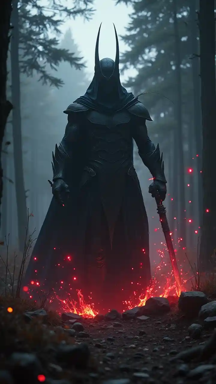 Quiero una escena hiperrealista. Está oscuro en el bosque y hay una sombra. Nos imaginamos que está liberando plasma como ondas a su alrededor. Está palpitando el suelo y rompiendo lentamente todo a su alrededor y se puede ver en la distancia. Es una toma blanca desde la vertical y puedes ver desde la distancia la cantidad de destrucción que está creando y dejándola, oscura y nublada. Se supone que es una foto aterradora y espeluznante de un superhéroe. No figure un hombre una sombra. Suponemos que se puede escapar de la destrucción de grado y tiene una fuerza increíble. No hagas que la figura sea un humano, hazlo alto, figura negra, empuñando, armas y armaduras, y cicatrices mirando hacia los cielos y la ira con aura, liberando todo a su alrededor realmente amenazante y haciendo que el aura sea roja