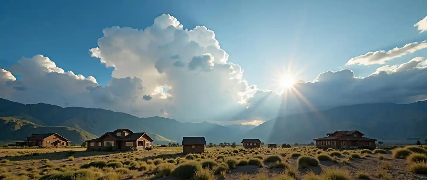 AidenPaisaje de Sierra Nevada con el sol en el cielo y algunas casas en primer plano, dramáticos cúmulos blancos de nubes de tormenta