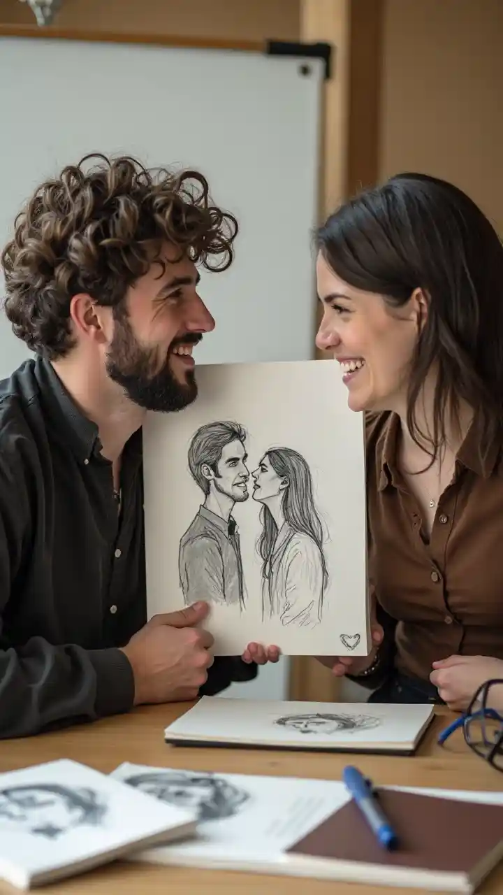 Un hombre y una mujer en una pareja mostrándose un boceto que dibujaron el uno del otro en una clase