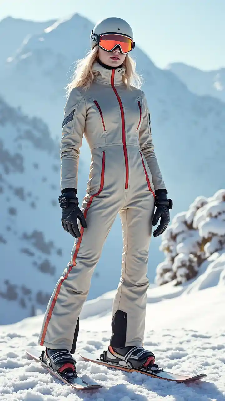 Elle Fanning, elegantemente vestida con un elegante y ajustado traje de esquí, se erige como el único foco en esta cautivadora escena. Inspirada en los estilos artísticos de WLOP, Artgerm, Peter Mohrbacher y Krenz Cushart, la composición se desarrolla en un impresionante telón de fondo de montaña nevada. La iluminación natural y volumétrica realza la escena, destacando tanto el sentido vanguardista de la moda como los intrincados detalles del traje. La paleta de colores es vibrante pero armoniosa, capturando la esencia de la moda moderna de esquí dominical con un toque de elegancia. El suave y refinado sombreado muestra la sofisticada belleza de esta obra maestra.