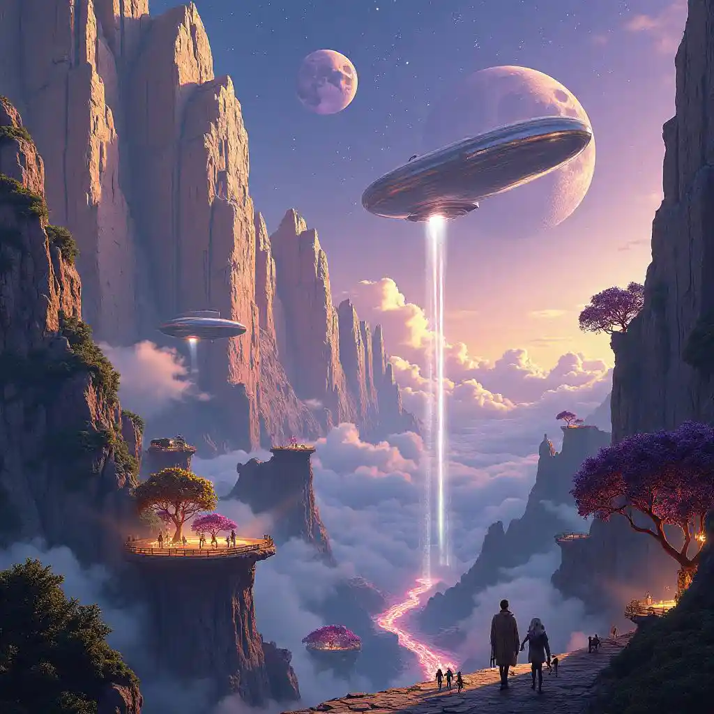 Una gran ciudad futurista flota en el cielo, suspendida por colosales cadenas doradas unidas a montañas brillantes y flotantes. En la distancia, una cascada masiva se vierte desde el borde de una montaña en las nubes de abajo, creando una niebla de arco iris. Extraños árboles bioluminiscentes con ramas arremolinadas iluminan las calles de la ciudad, donde los humanos y las criaturas alienígenas caminan uno al lado del otro. Aeronaves gigantes con forma de dragones se deslizan por los cielos, proyectando reflejos brillantes en los edificios de vidrio. Por encima de todo, dos lunas brillan en un cielo púrpura iridiscente, su luz entretejida con estrellas centelleantes