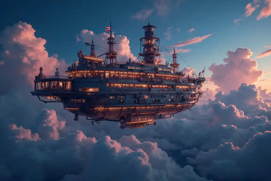 ((súper lujoso barco pirata volador gigante crucero barco pirata,, steampunk, Pirate Airship)), (la luz del cielo brilla por encima de las nubes), luces de neón, Spectacu
