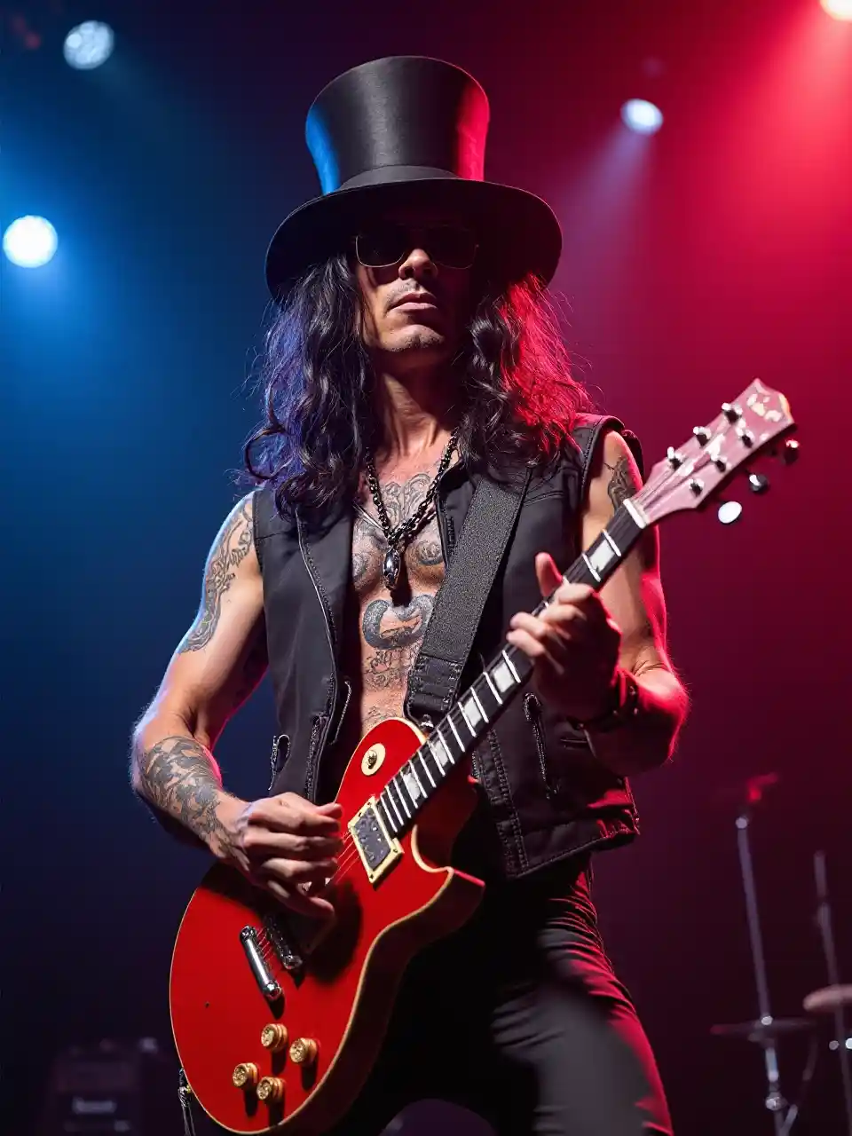 persona, guitarrista de Slash, foto, en el escenario, luces de estudio, cara iluminada, guitarra roja en la mano, colores brillantes, sombrero de copa en la cabeza
