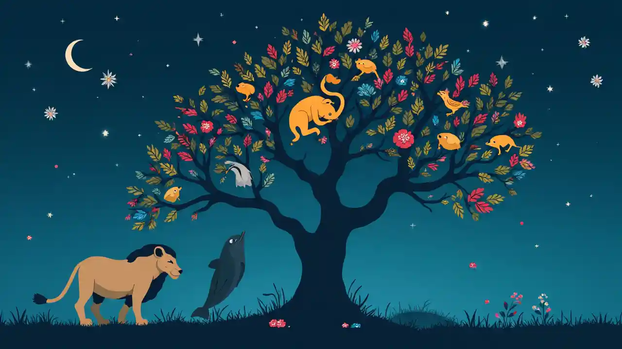 Árbol evolutivo con animales durmiendo en sus ramas - león, pájaro, delfín, humano - todos acurrucados en una posición para dormir, Infografías coloridas estilizadas como Kurzgesagt, tonos azules profundos con cálidos acentos de luz.
