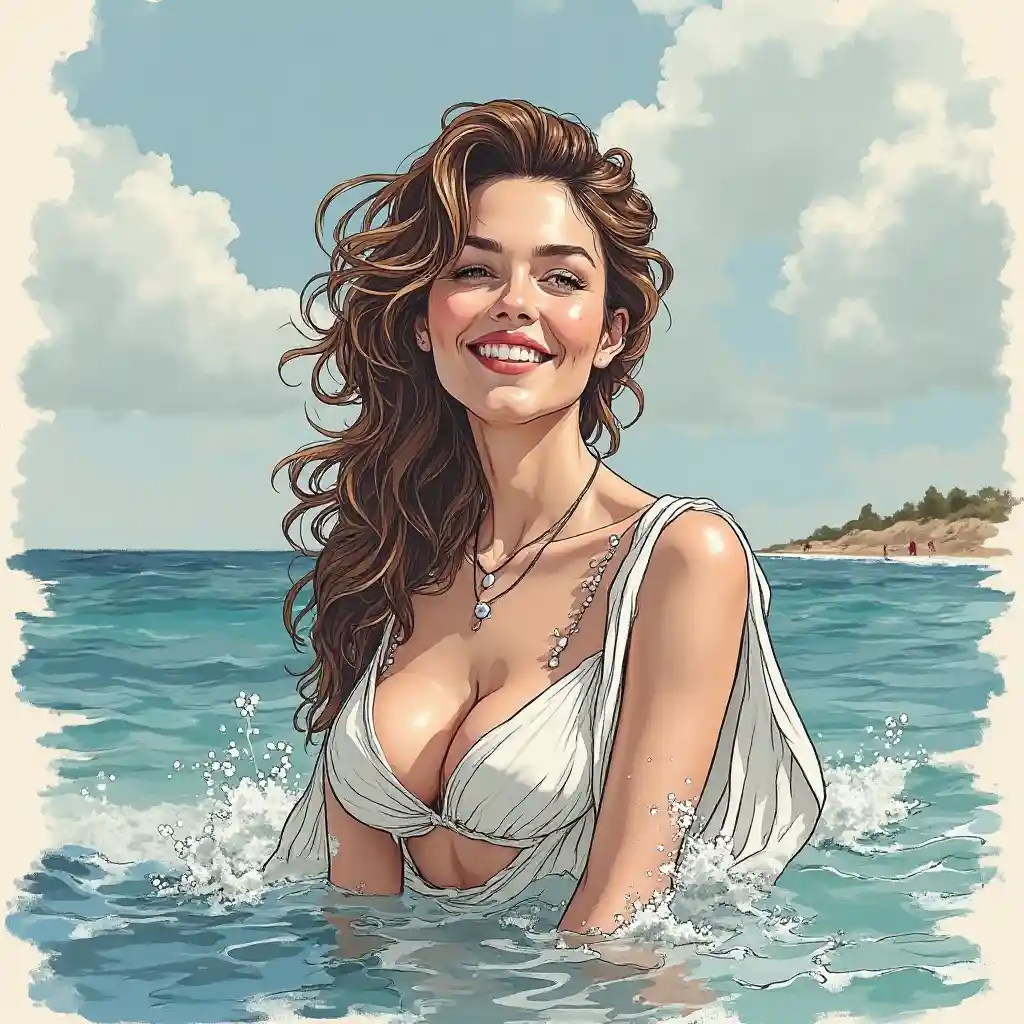disegnami una donna sorridente in riva al mare che alza le mani e respira a pieni i polmoni