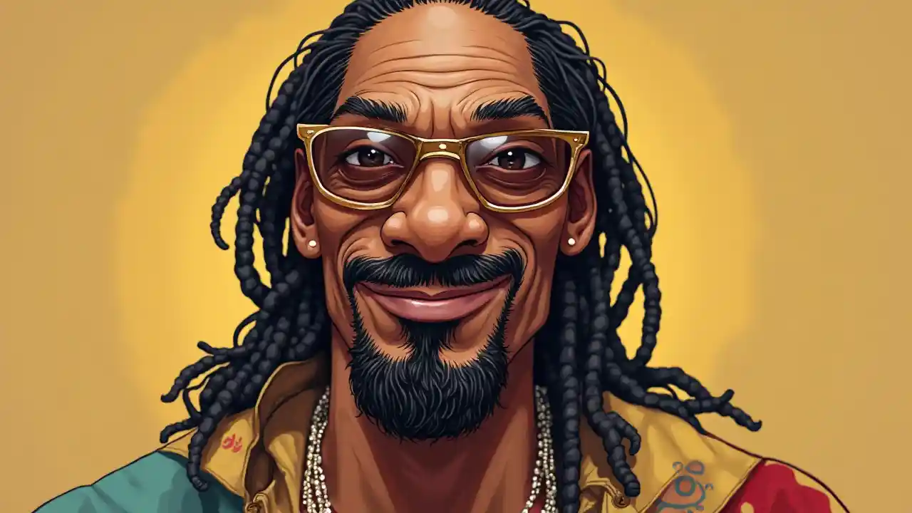 un retrato cómicamente exagerado de un Snoop Dogg, destacando características humorísticas y extravagantes. Adopte elementos caricaturescos y exageración juguetona para resaltar el humor en el estilo de apariencia del sujeto en bruto