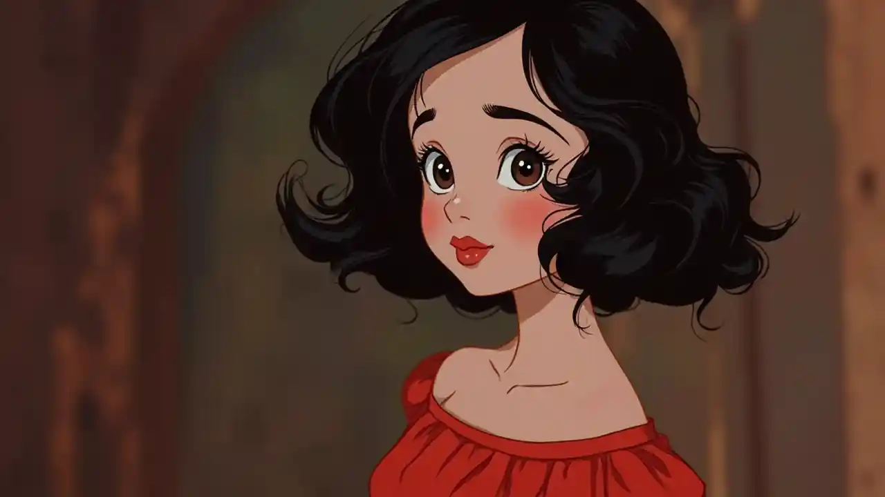 Hermosa joven adolescente, princesa, muy pálido, cabello negro rizado y ojos oscuros, Blancanieves, estilo de 1930, dibujos animados de Disney cobran vida, vestido rojo, cara dulce inocente