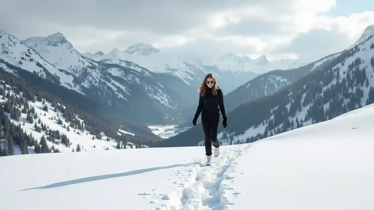 Un paisaje montañoso nevado con una mujer joven en el centro. El paisaje se compone de picos nevados, bosques y valles profundos, con un cielo gris, ligeramente nublado en el fondo. Las montañas están cubiertas de nieve y varían en altura, dando a la imagen profundidad y perspectiva. La mujer en primer plano de la imagen camina por un sendero recién cubierto de nieve con huellas detrás de ella. Está vestida toda de negro: pantalón negro, top de manga larga y gafas de sol oscuras. Sus botas blancas se destacan fuertemente contra la blancura de la nieve. Su sombra se proyecta sobre la nieve, hacia la izquierda y hacia atrás. Los colores de la imagen son naturales, con la nieve blanca dominando, contrastando con la ropa oscura y el verde del bosque lejano. El ambiente es fresco y limpio, típico de una fría caminata de montaña en invierno.