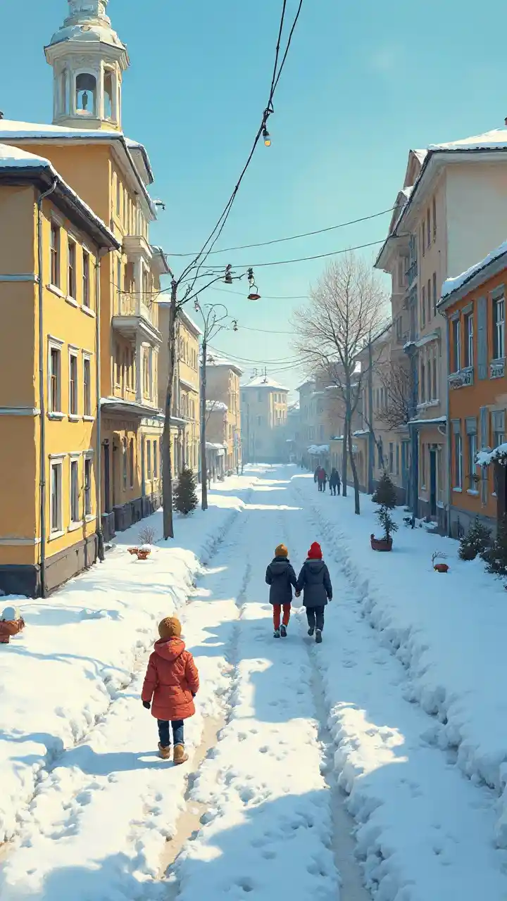 una pintura que muestra a los niños en una calle nevada de Europa del Este, en el estilo de filip hodas, celeste y amarillo, sovietwave, elegantes paisajes urbanos, vista aérea, mort künstler, nikon d850 --ar 64:51