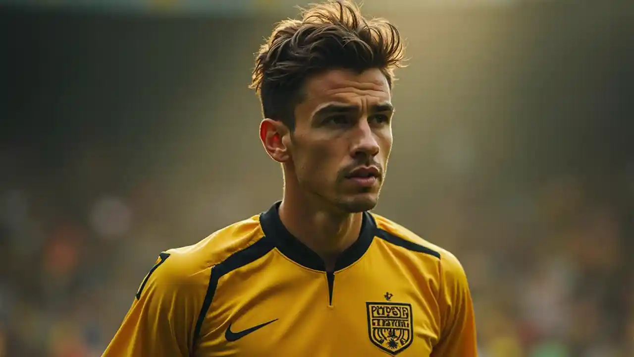 Retrato del jugador de fútbol inglés 1900, camisa amarilla y negra, ilustración de revista de moda, enfoque nítido, iluminación dramática, profundidad de campo, fondo borroso