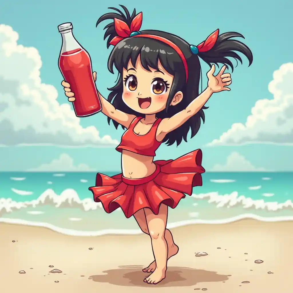 Una niña con una botella de refresco roja diciendo que levanta bastones de pollo como el cabello y un tutú rojo → Conviértelo en una niña tipo dibujos animados de pie con la playa detrás de ella