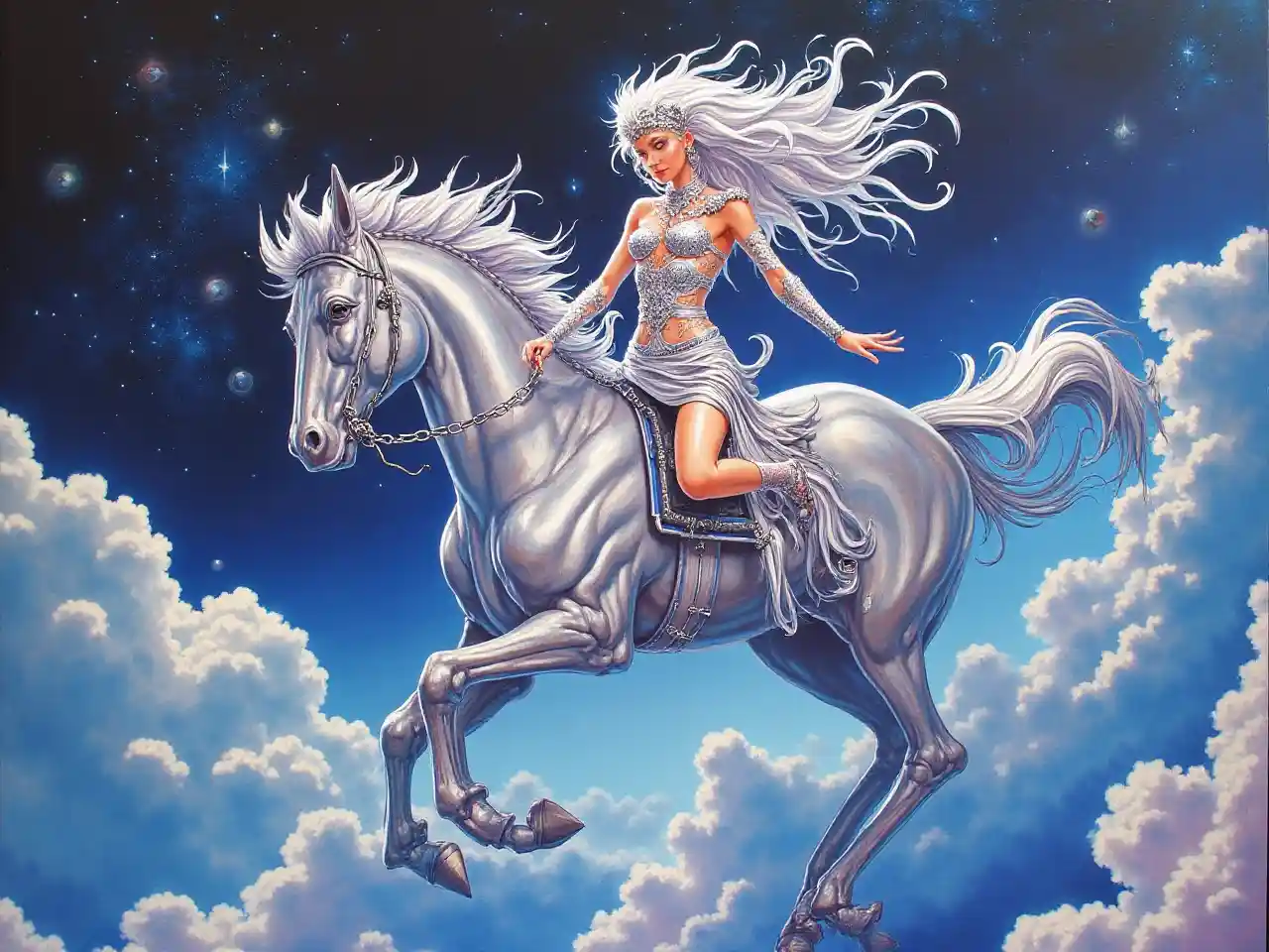 rubylynHajime Sorayama, diosa, brillante, metálico, aerógrafo, espacio, nubes, colorido