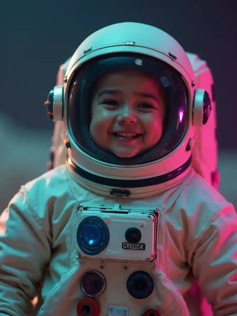Pianeerfotograma de la película, foto de un astronauta con cara feliz, asteroide arco iris, índigo claro, rosa neón y beige oscuro, tonos apagados