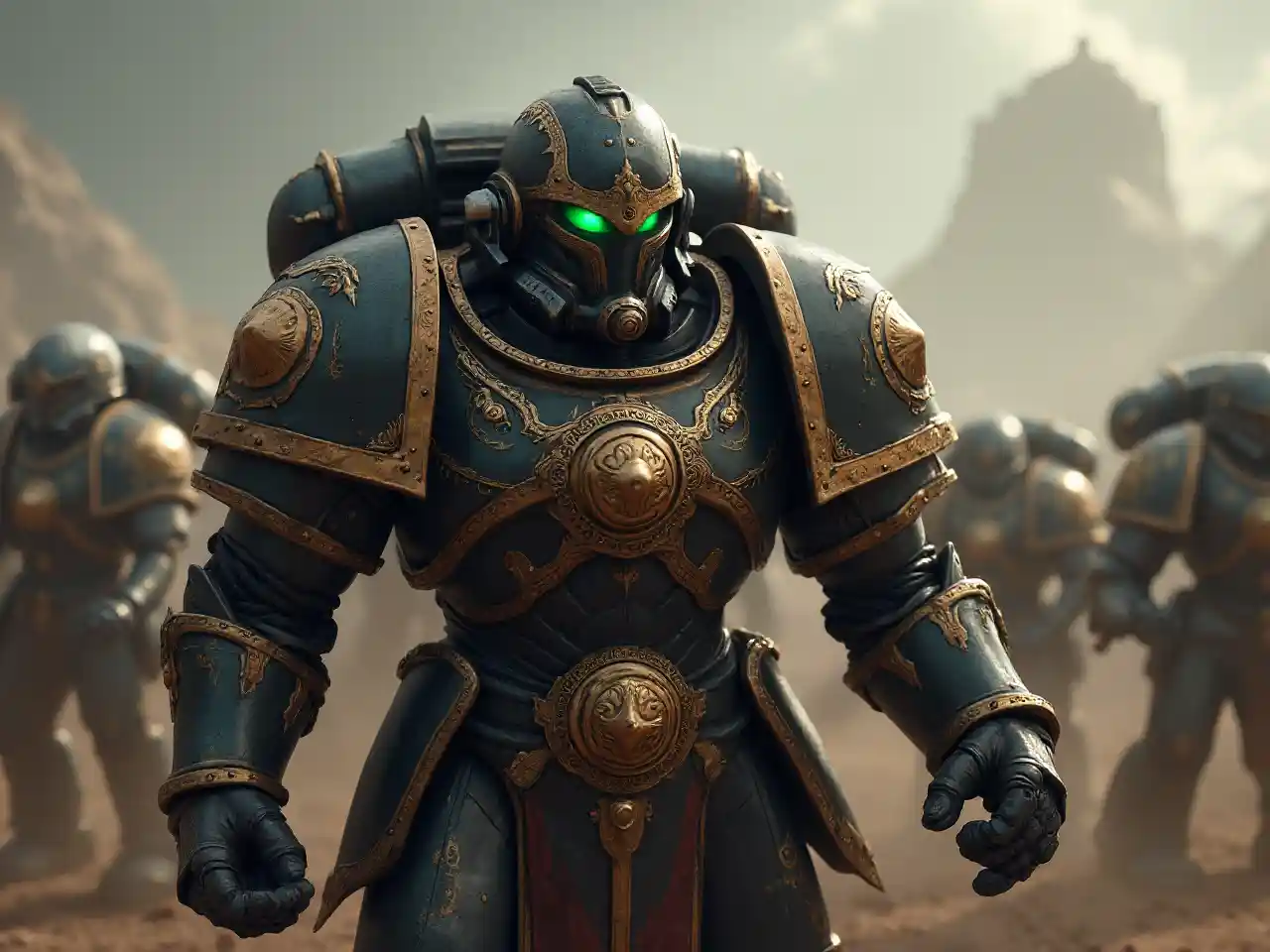 Marine espacial de 40k sin casco con ojos verdes en armadura dorada adornada negra luchando contra un ejército de robots con tres aliados