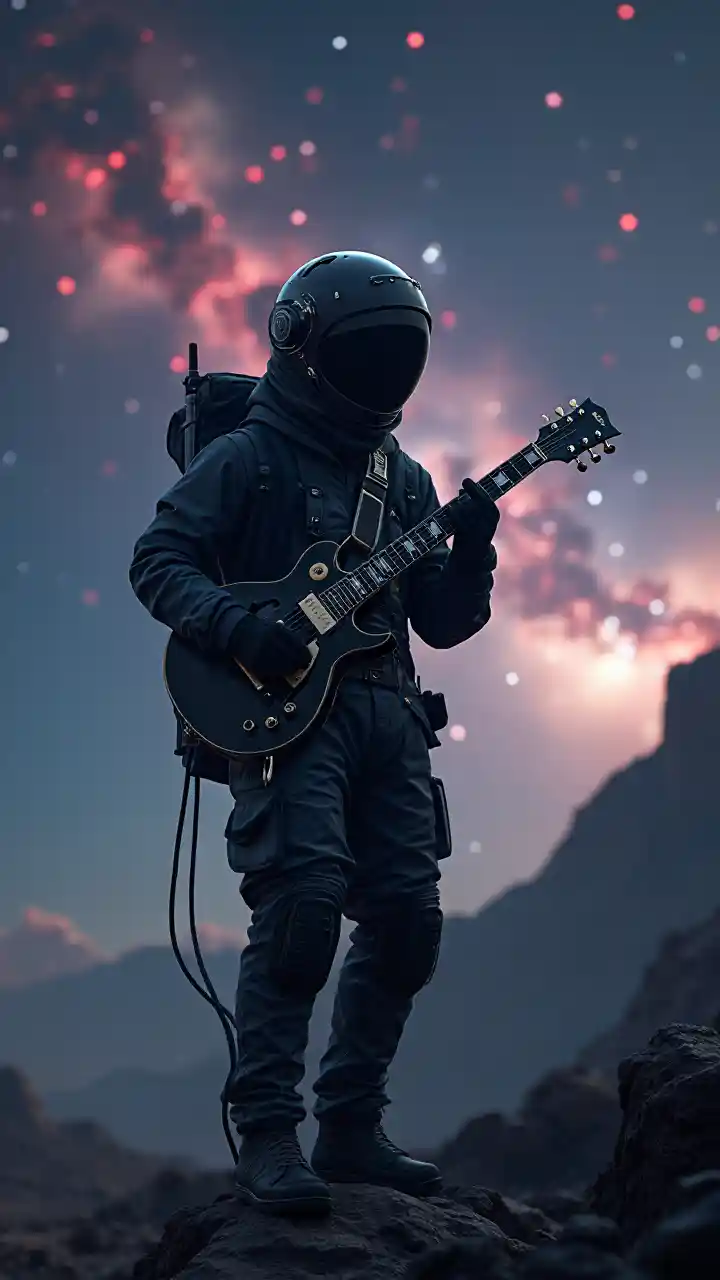 un astronauta de negro, mirando hacia el universo, tocando el instrumento de guitarra, cuerpo completo, casco, refracciones, daft punk, espacio en el fondo, nubes de nebulosa, hiperdetallado, arte digital, tendencia en la estación de arte, iluminación cinematográfica, calidad de estudio, liso render, motor irreal 5 renderizado, octanaje renderizado