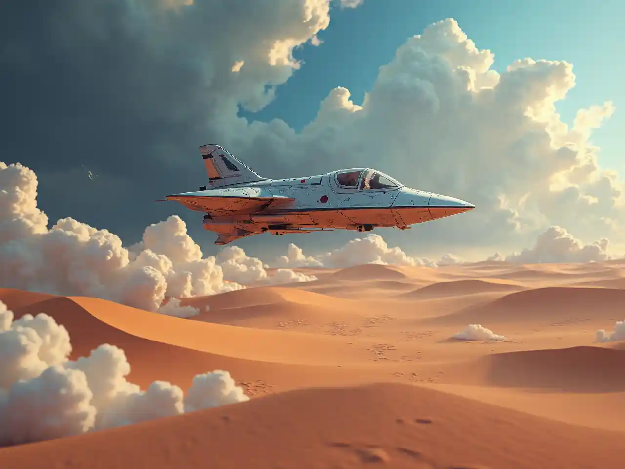 HarperNave espacial brillante isométrica está volando a través de nubes tormentosas sobre el desierto de arena