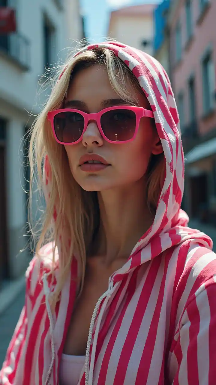 Spider Gwen en la estética casual, rayas, sudadera con capucha, tela de araña, gafas de sol rosas, Olivier Valsecchi, composiciones a rayas, efectos de ojo de pez, ultra gran angular, retratos con emoción, líneas ondulantes