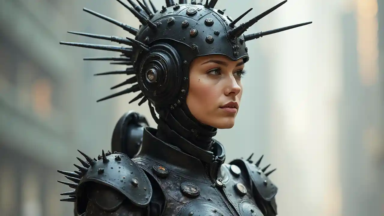 una mujer con un traje futurista con púas en la cabeza y un casco en la cabeza Moda vanguardista