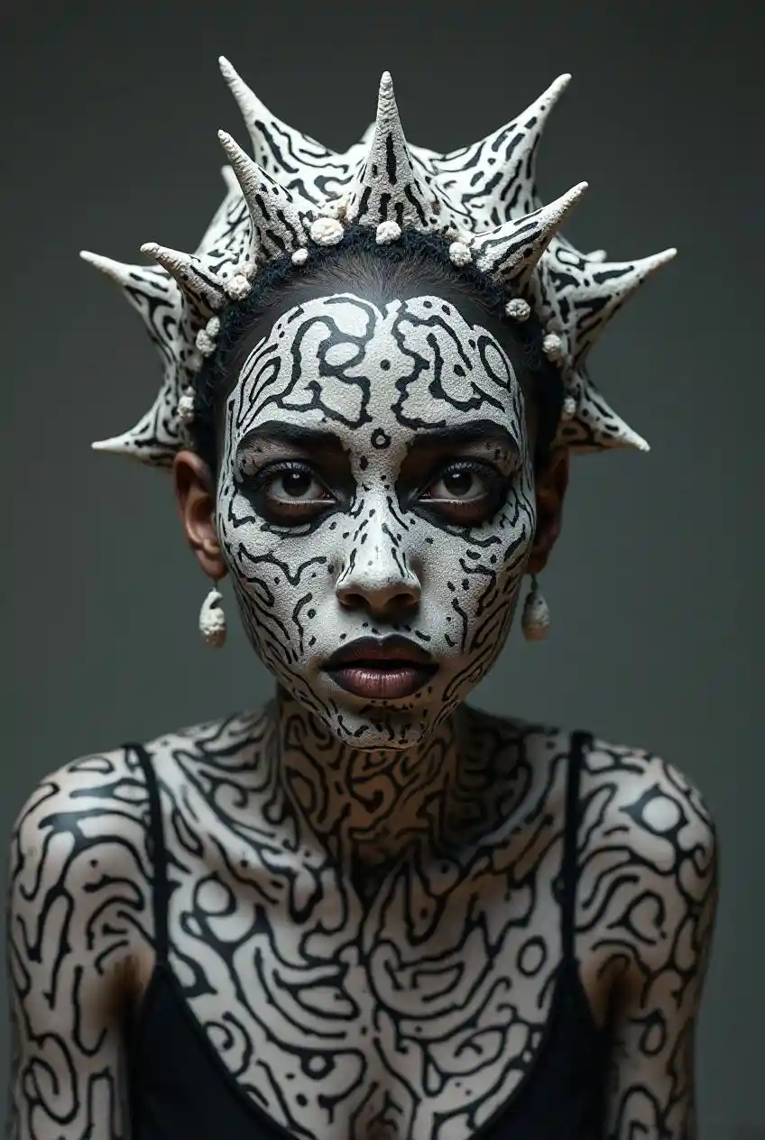 mujer con piel estampada, fotografía de moda, apariencia surrealista, apariencia de tribu, piel blanca y negra, cabeza rapada, cabeza con forma de estrella, hermosa y extraña, de otro mundo, moda de alta gama, plano medio