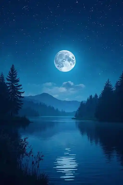 LucasCrea una escena visualmente encantadora con un cielo nocturno estrellado con una luna brillante iluminando un lago sereno en el fondo. El cielo estrellado debe estar lleno