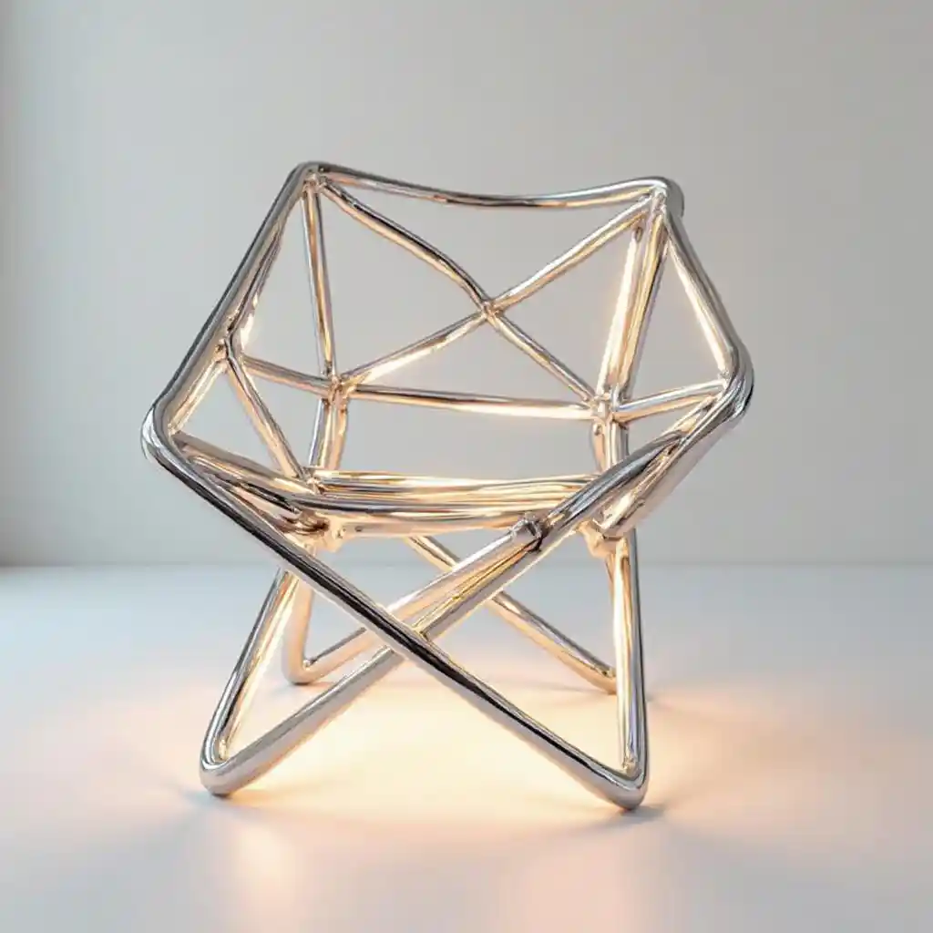 A futuristic and elegant glowing geometric metal isometric chair made from steel for living room with White background stainless steel painted
