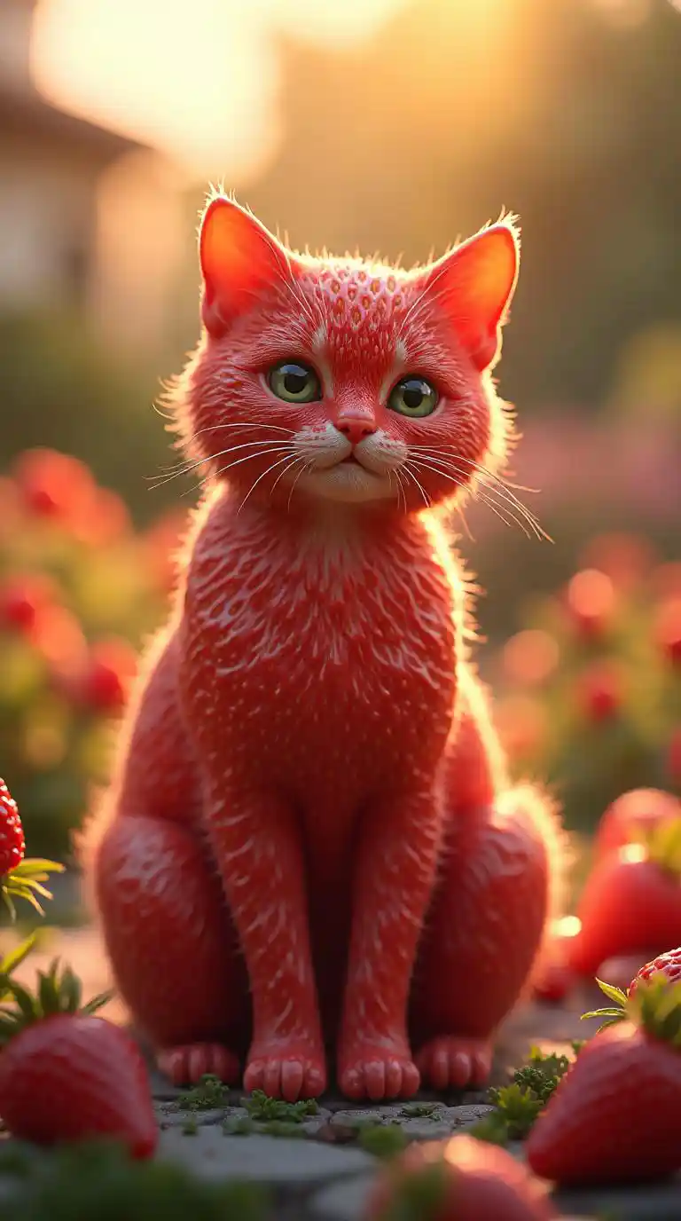 Un gato hecho completamente de revestimiento de fresa, cada uno se asemeja a la forma de una piel de fresa, con una textura dura y brillante. El gato es lindo en un jardín durante la hora dorada, con la cálida luz del sol iluminando suavemente su cuerpo, creando un contraste sereno y mágico contra el fondo fresco y soleado. El entorno presenta flores borrosas y elementos arquitectónicos sutiles, que agregan profundidad y un ambiente de verano tranquilo