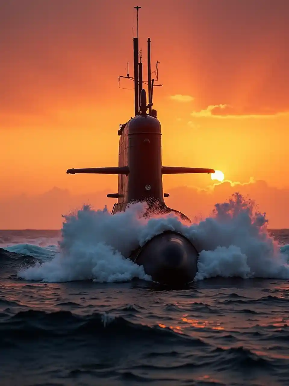 Submarino nuclear emergiendo contra una impresionante puesta de sol