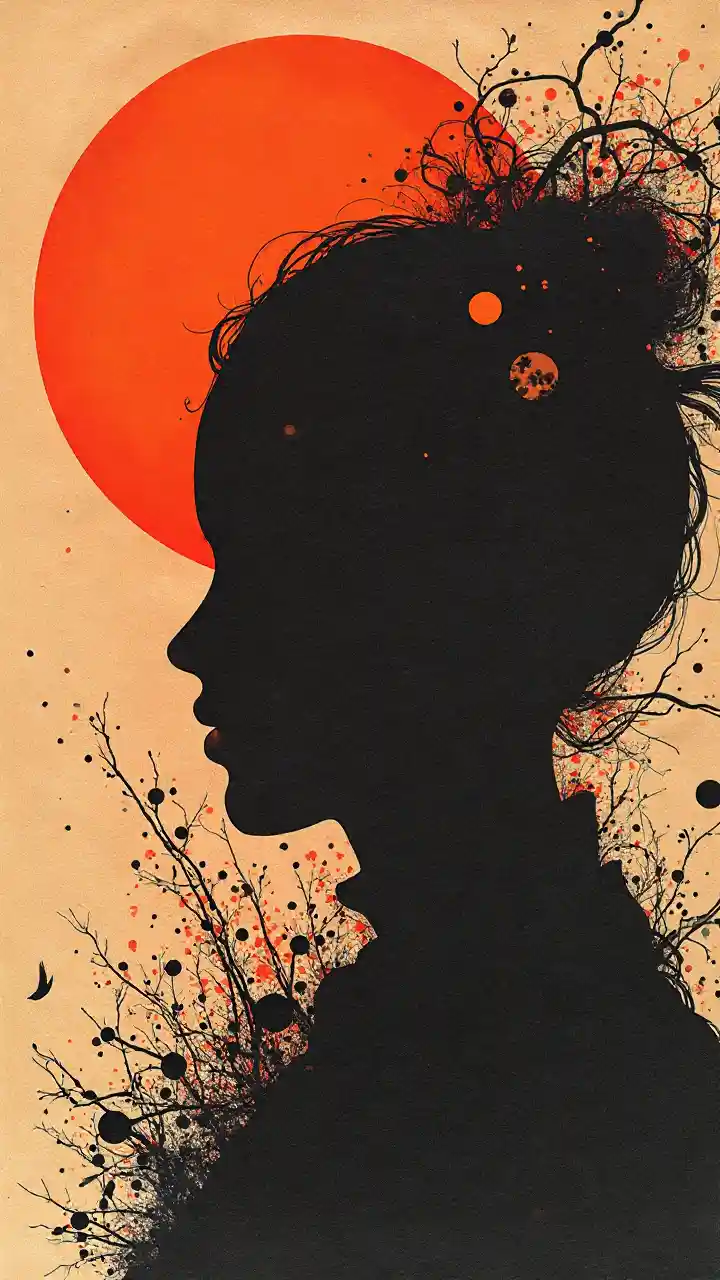 Perfil de sol + patrón de medio tono + ilustración editorial del memento morti + higly textured, género que define la pintura de collage de medios mixtos + absurdo marginal + ilustración de patrón de medio tono galardonada + formas fluidas simples + sombras sutiles + textura de papel + esquema de color minimalista + inspirado en zdzisław beksiński.