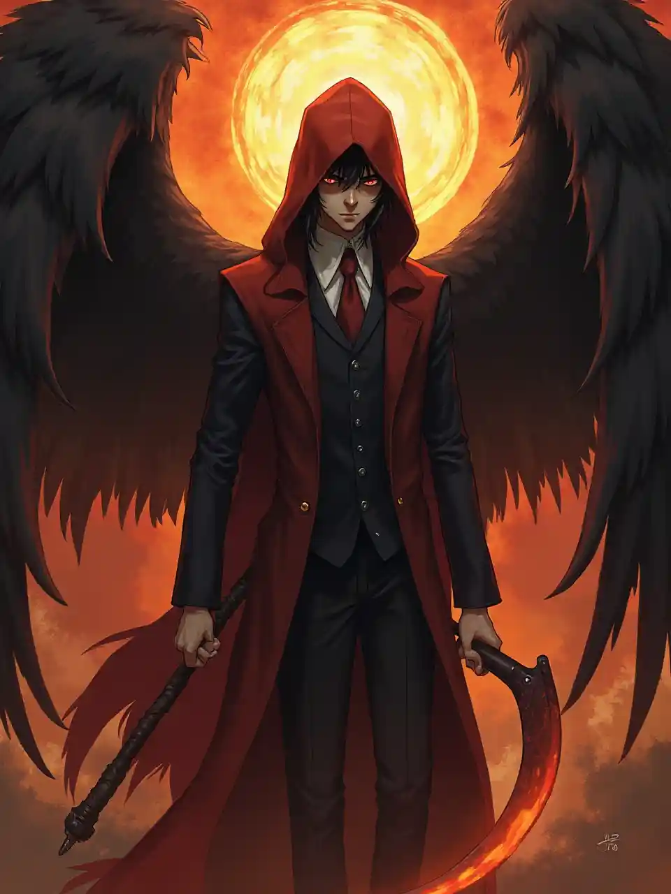 @ ychzi2YTltDkbLMIrn2Y se está convirtiendo en un segador de sol con enormes alas negras y sus ojos están en llamas, lleva un uniforme de internado inglés rojo y negro, lleva una guadaña, le preocupa este poder dentro, tiene miedo