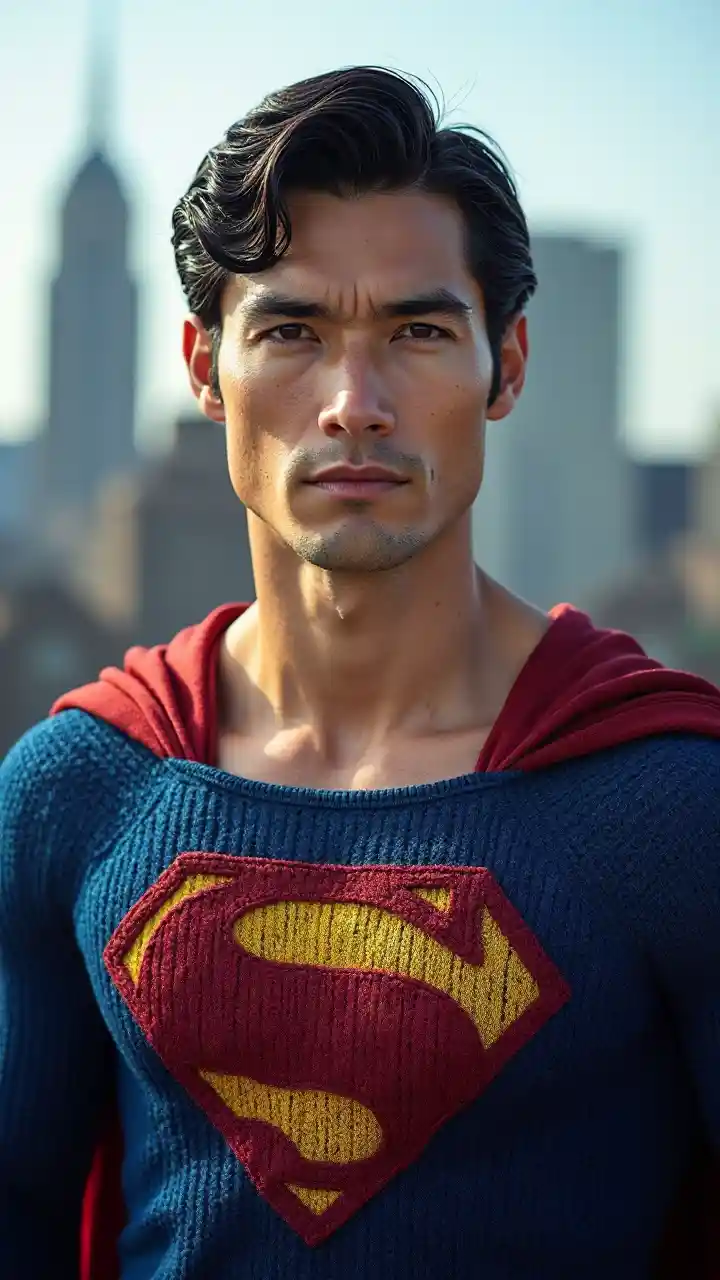 Superman en Retrato de Traje Tejido con Fondo de la Ciudad