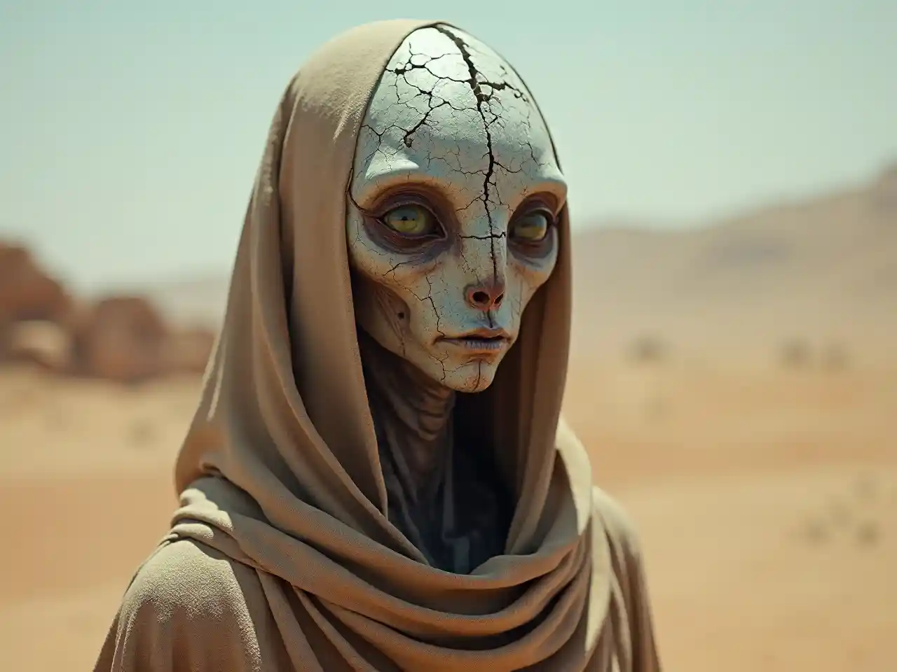 Arte digital surrealista y enigmático que representa una figura alienígena humanoide con una cabeza agrietada y herida, de cara al espectador en un paisaje desolado del desierto. La cabeza del alienígena, adornada con una capa fluida y cubierta, parece mezclarse a la perfección con el entorno árido y apocalíptico. Su cara, con ojos grandes y luminosos, captura un sentido de conocimiento antiguo y conexión con el entorno alienígena. El ambiente es seco y claro, con una luz suave y natural que realza el tono dramático y místico de la imagen.