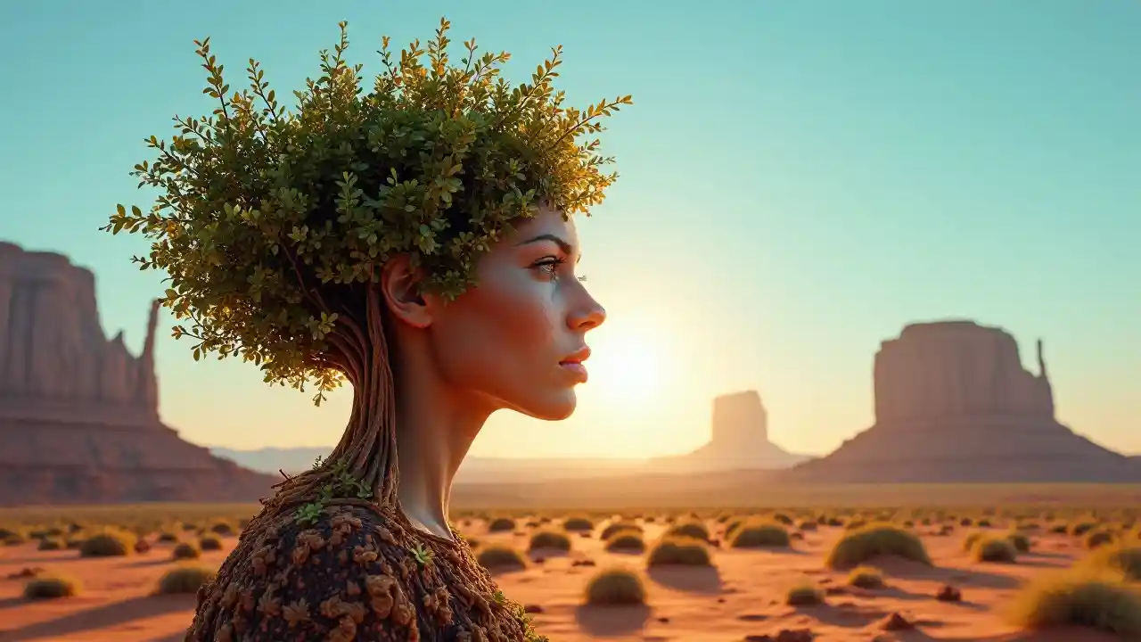 Visualice un desierto surrealista iluminado por el resplandor de la hora dorada. En el centro hay un perfil lateral de una mujer con una cara fotorrealista que se asemeja a un humano real. A partir de sus detallados ojos, nariz y barbilla, el resto de su cabeza se transforma en un árbol que da forma y llena la estructura de la cabeza. Este árbol, densamente lleno de hojas, tiene una calidad semitransparente similar al vidrio, con espacios entre sus ramas que ofrecen destellos del cielo detrás. El desierto debajo está salpicado de mechones de hierba, mientras que las icónicas formaciones rocosas rojas se alzan en la distancia contra un cielo azul vívido