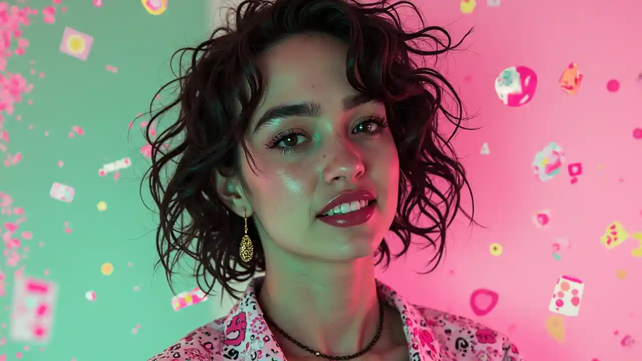 Pink green black cream noise patterns risograph girl, happy surrealism, fashion, shot on sony, editado con Maya, Nuke, Blender, Fusión, Houdini