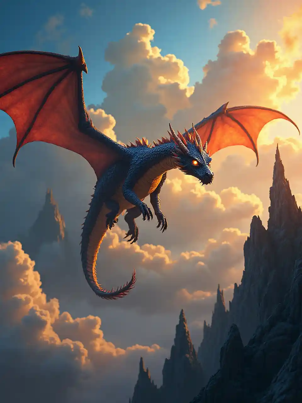 Dragones volando a través de un cielo místico, antiguos paisajes de fantasía, escamas vibrantes que brillan con colores iridiscentes, encantadores ojos brillantes, imponente pero majestuosa presencia, nubes arremolinadas y montañas distantes que agregan profundidad, capturando sus cuentos legendarios, ambiente cálido y mágico, entornos intrincadamente detallados, ultra detallado y de alta definición, evocando asombro y maravilla. < < THE _ MARKER > > quiero contar la historia de los dragones.