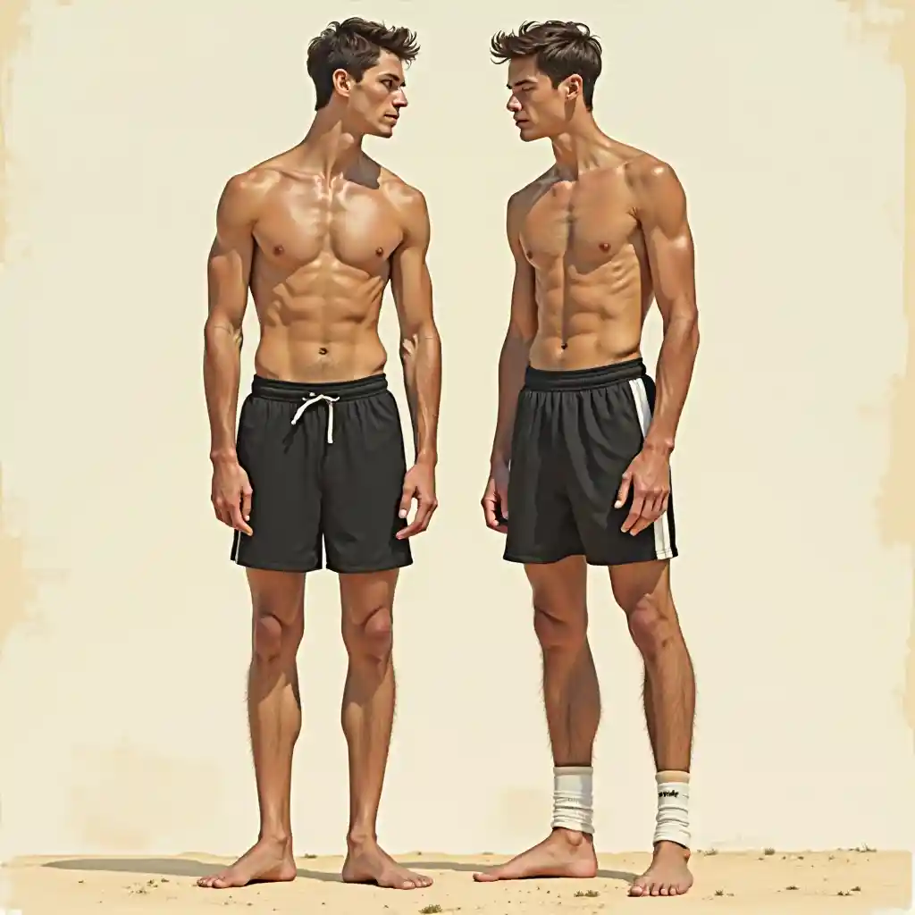 Jugadores de malevolley jóvenes de 8 pies más altos descalzos con piernas largas junto a un hombre joven de 6 pies de altura