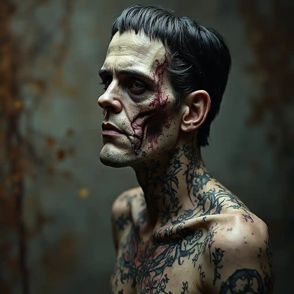 Frankenstein con tatuajes, cicatrices, puntos de sutura