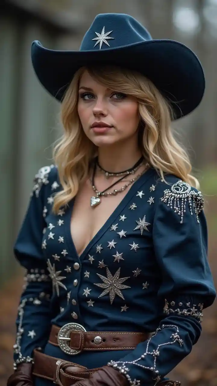 IsaiahTaylor Swift como vaquera en la era azul oscuro y plateada con Colt y sombrero y estrellas brillantes