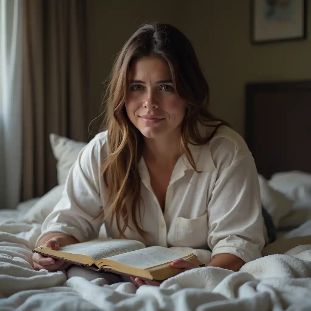 Persona sentada en su cama, la Biblia abierta, los ojos llorosos.