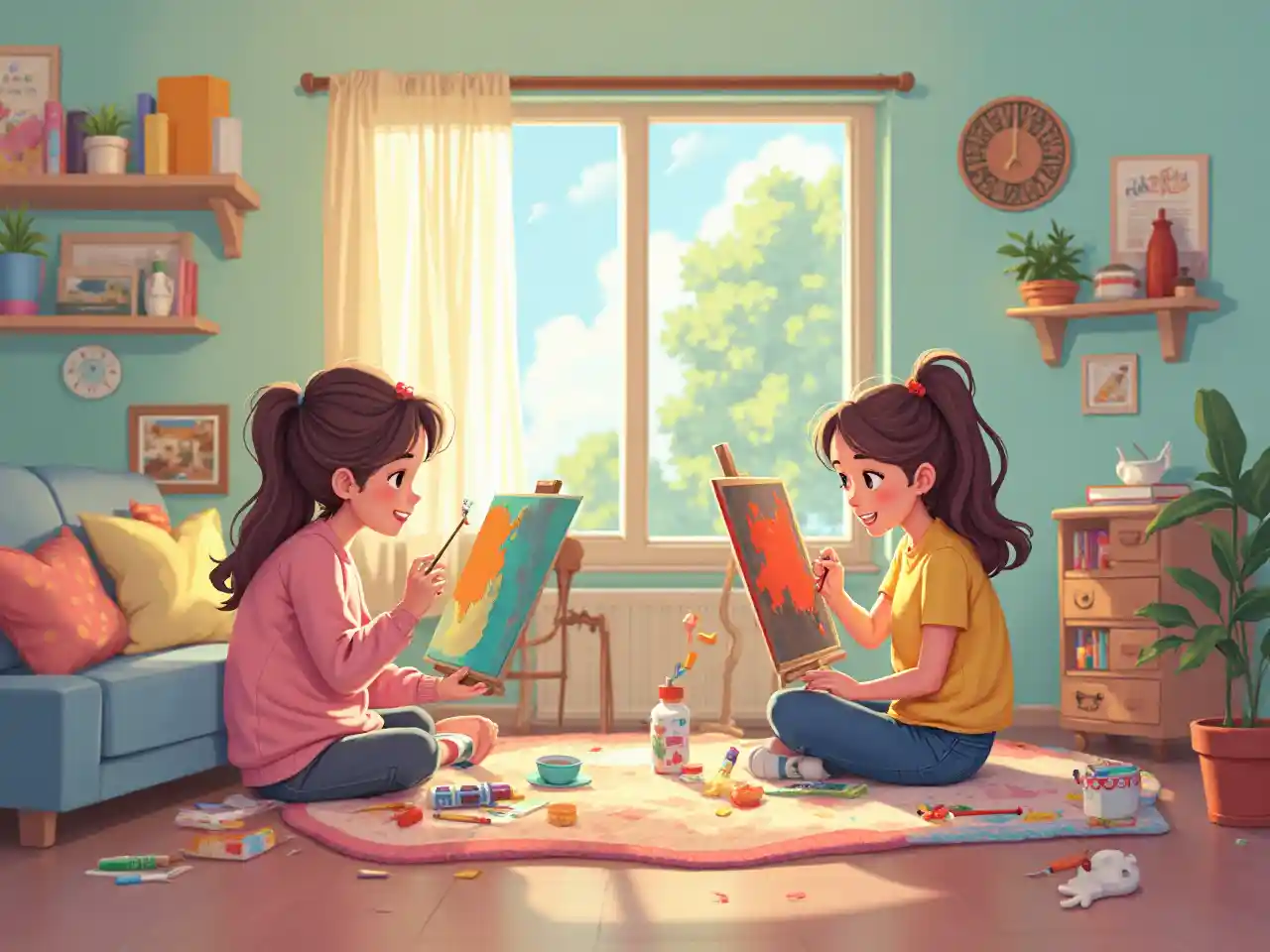 ScarlettIlustración digital colorida de adolescentes pintando y relajándose en una habitación acogedora.