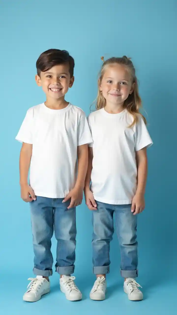 Chloeun niño y una niña con camisetas blancas, parados frente a un fondo azul, camisas en blanco sin estampado, niños pequeños sonrientes de 3 años, foto para la maqueta de ropa