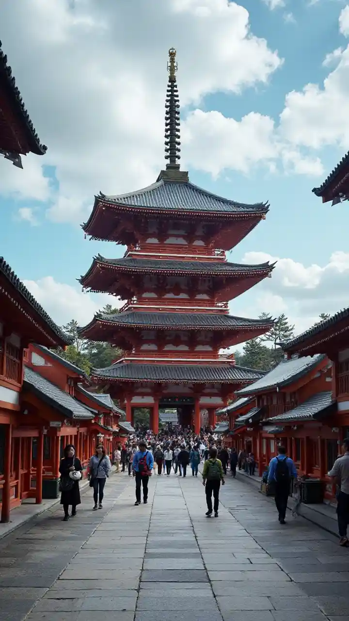 una pagoda con una torre alta en el fondo y algunas personas caminando alrededor de ella en frente de ella, el templo Senso-Ji en Tokio.