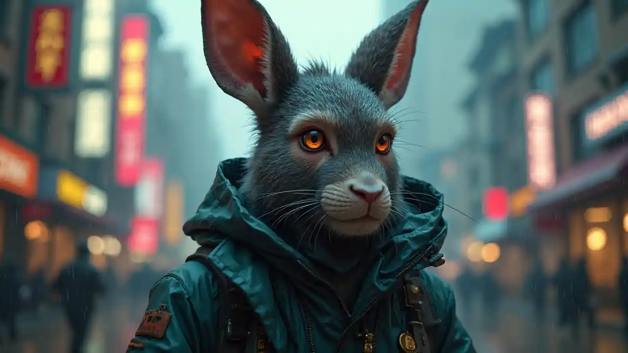 Un rey mono adulto se encuentra en una ciudad cyberpunk, bajo la lluvia. Lleva una chaqueta estilo cyberpunk y el logotipo de bitcoin. El rey mono tiene un aumento en su ojo derecho y muchas cicatrices. Los implantes Kierpunk son visibles en el conejo. Una obra maestra, máximo detalle, cinematografía