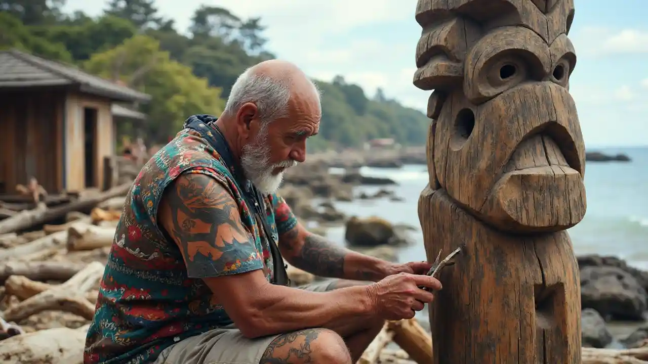 Tallando un tótem en un pueblo costero, un isleño del Pacífico de 76 años con tatuajes usa una túnica con bordados de olas. La madera flotante y las gaviotas lo enmarcan, sus cinceles constantes irradian habilidad y orgullo cultural en un entorno vibrante y natural. Su trabajo honra las mareas.