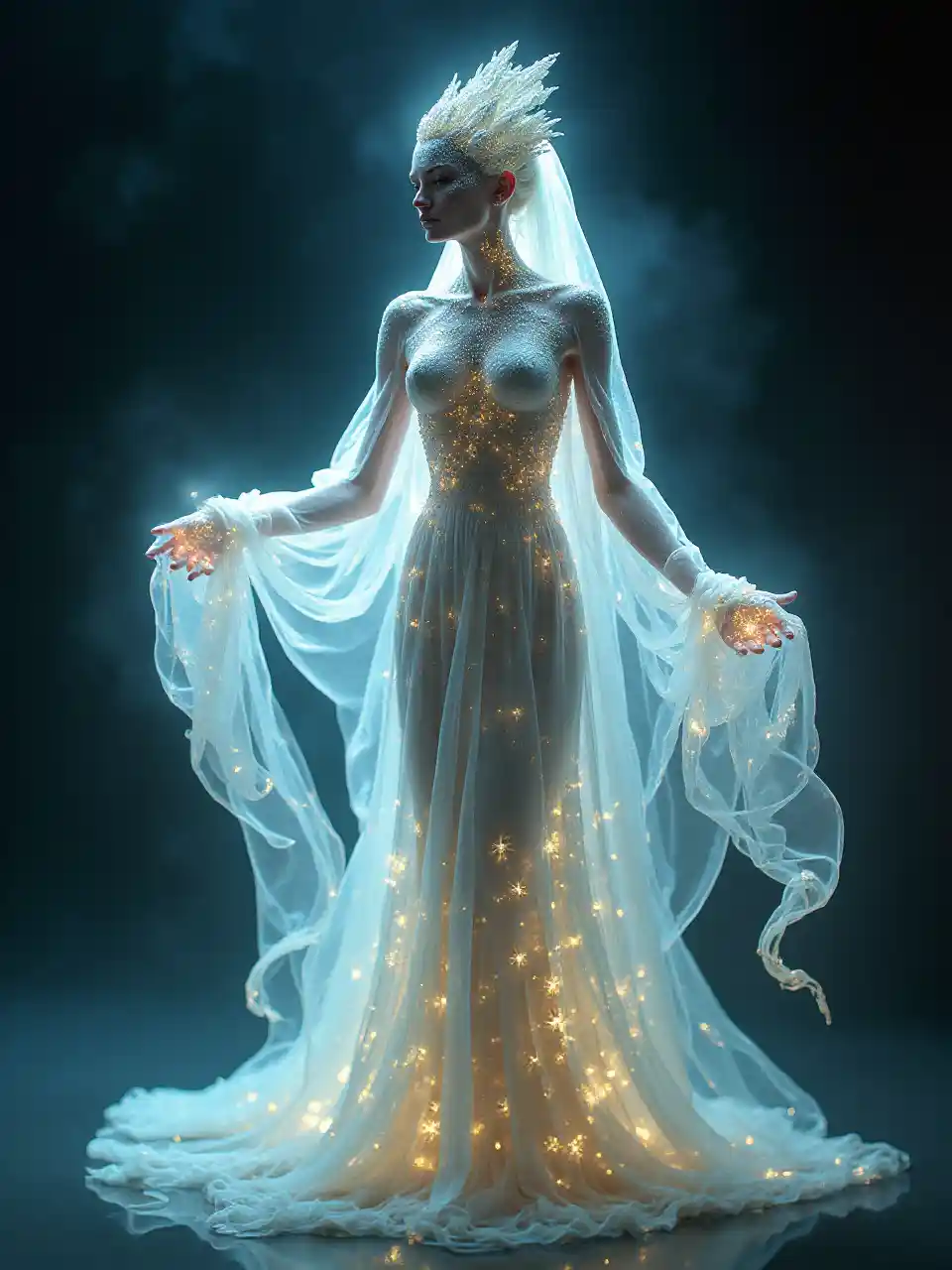 detalles elegantes e intrincados, superficies reflectantes, escamas iridiscentes y luminiscentes, luz brillante desde adentro, toma de cuerpo completo de un hermoso fantasma translúcido, con mangas fluidas que se despliegan como zarcillos etéreos, proyectando un brillo suave y encantador alrededor de su forma