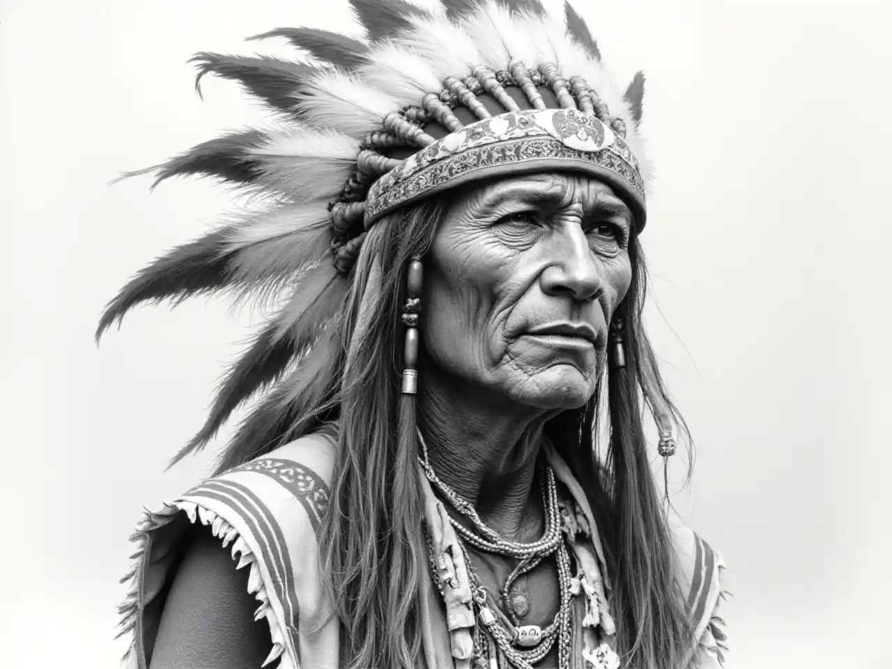 AuroraLíder tribal indio, ilustración, Lápiz, Retrato, B & W, Estados Unidos, estilo de Laurie Lipton