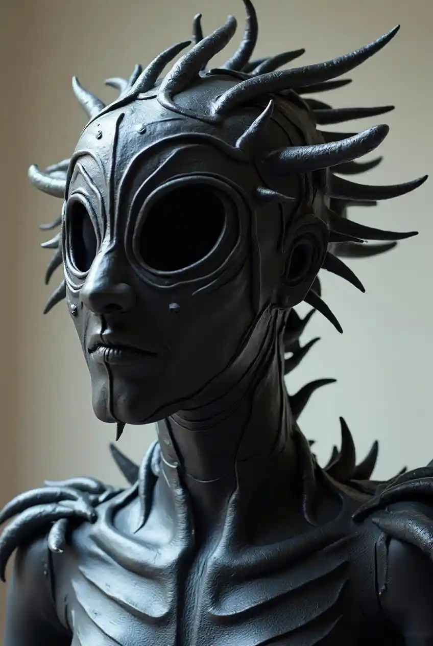 pxlsort, La imagen representa una pieza de cabeza llamativa y no convencional. tribal, anémona como estricturas. arrecife de coral. colores brillantes Parece ser una máscara o casco, elaborado a partir de un material oscuro y gomoso, probablemente látex. El diseño de la máscara es dramático y angular, con una serie de estructuras superpuestas en forma de pétalos que irradian hacia afuera desde un punto central. Estas estructuras se mantienen en su lugar mediante pequeños remaches de plata La máscara cubre toda la cabeza, extendiéndose hasta el cuello. Cuenta con un solo ojo circular, que está enmarcado por un borde elevado. El interior de la máscara está forrado con un material liso y oscuro, posiblemente de terciopelo o satén, lo que sugiere comodidad y lujo. La máscara se muestra en un maniquí, que también está vestido con un atuendo oscuro y gomoso. El cuerpo del maniquí está adornado con una serie de púas y protuberancias, creando una sensación de tensión y agresión. El efecto general es uno de una criatura futurista, de otro mundo, a punto de atacar. La máscara, en particular, es una pieza cautivadora de arte portátil, que combina elementos de moda, escultura y performance.