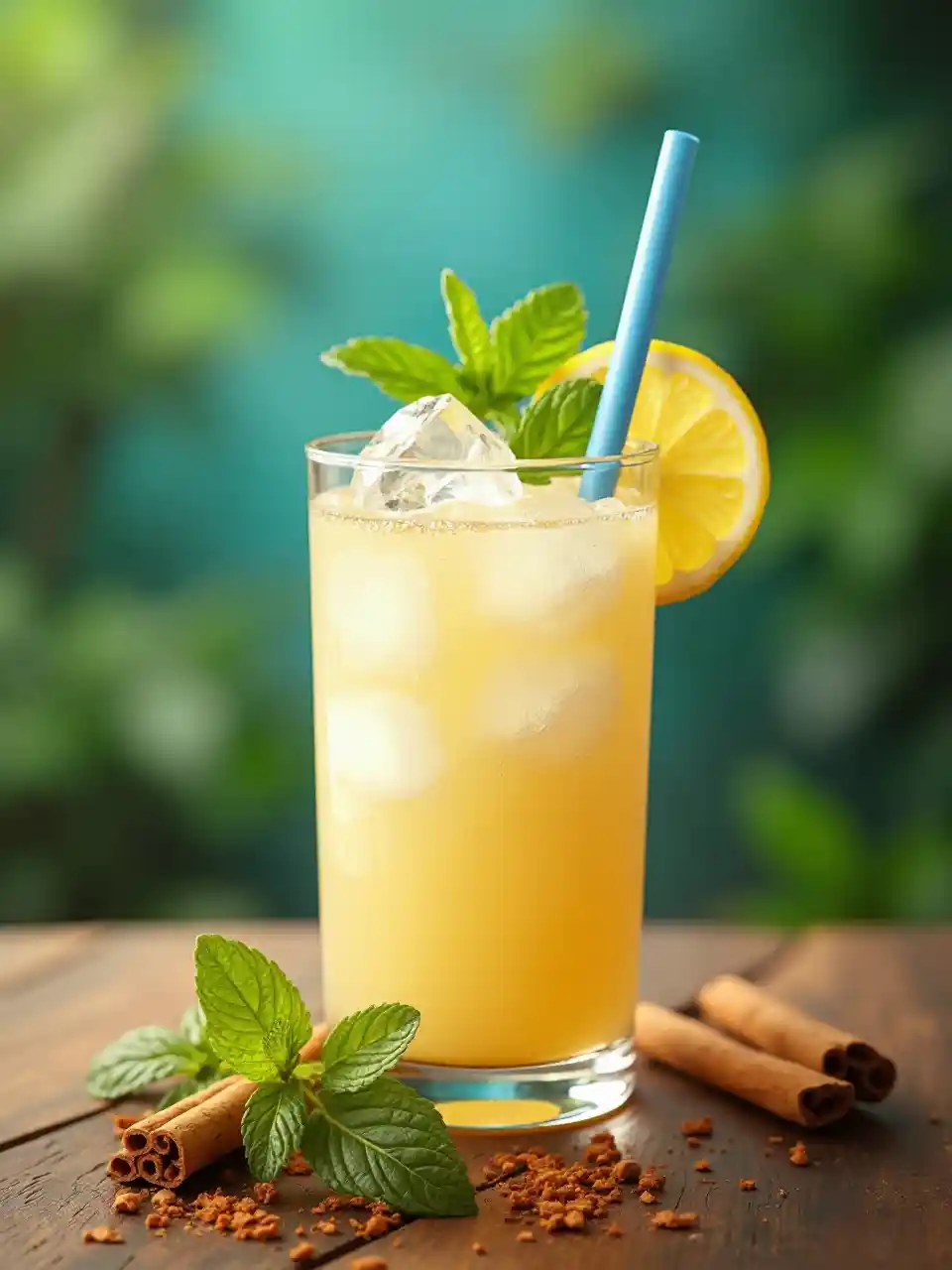 Una hermosa bebida blanca y corta realista hecha de plátano y limón, miel y canela, en un vaso de whisky con gotas de agua, con paja azul, hielo y hojas de menta decoración sobre fondo tropical