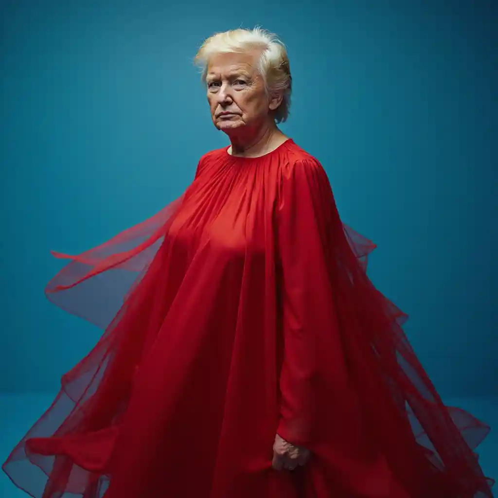 LandonDonald Trump, vanguardista, simplygo, photoshoot spread, vestido todo de fondo rojo, azul, harpers bizarre, cover, headshot, hiper realista